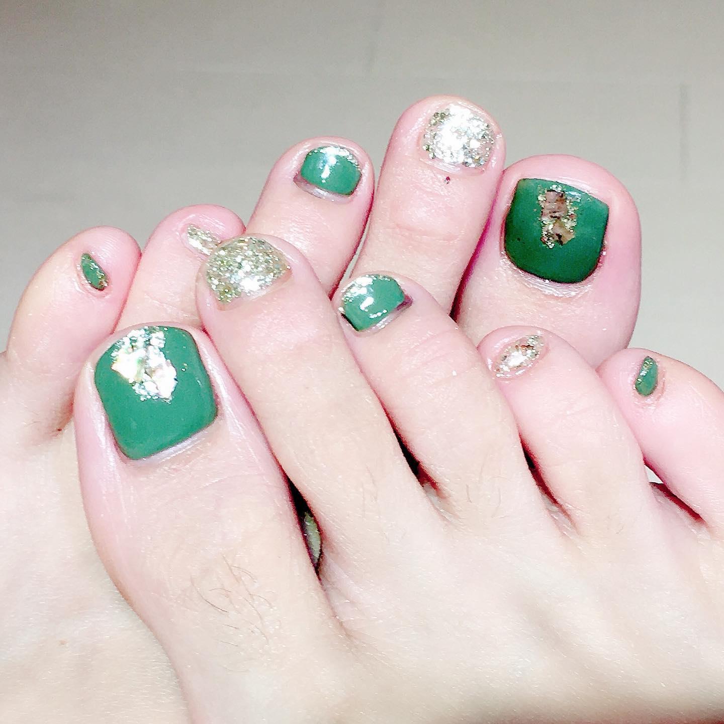 【秋おすすめフットネイル】秋色グリーンフットネイル💅桜新町ネイルサロンpeep-PEEP