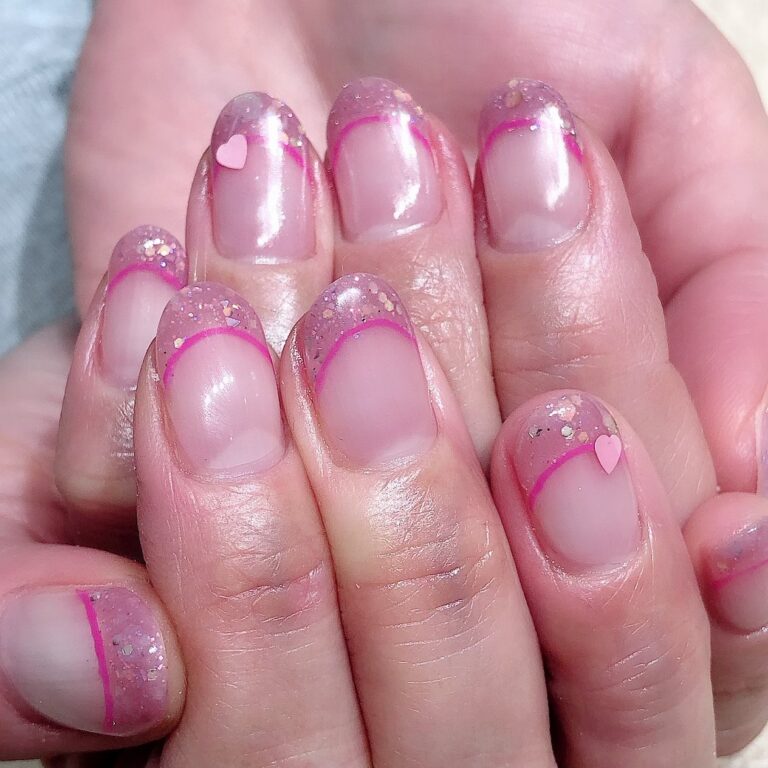 ラブリーなピンクのラメフレンチに、ピンクのライン