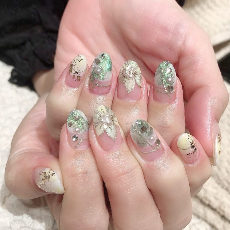 イエローとグリーンを取り入れて、爽やかな新緑の季節にピッタリな華やかネイルです。