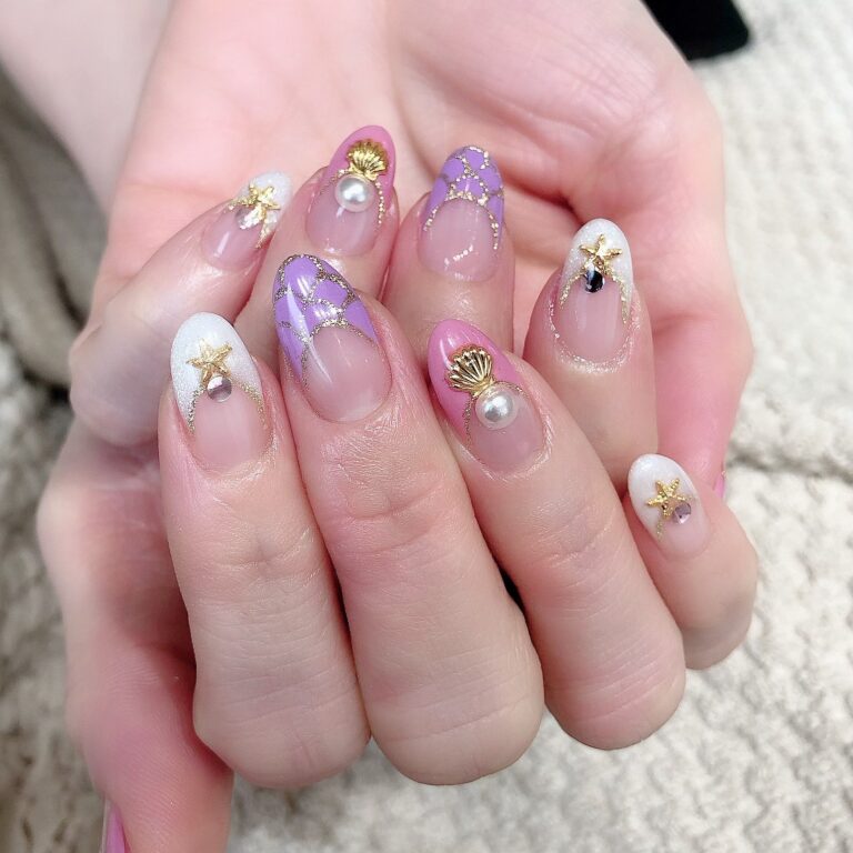 フレンチネイルに、シェルやスターフィッシュをあしらったマーメイドネイル